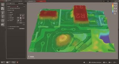 显示集成电路芯片和焊点的局部 PCB 三维图像;利用 Leica DVM6 通过 LAS X EDOF(扩展景深)功能捕捉。亦可参见右侧带彩色 Z 标尺的相同图像。