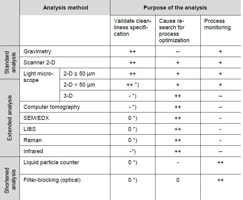 清洁度分析主要包括颗粒的总重量、颗粒或纤维识别、颗粒的长度与宽度、颗粒的高度、颗粒的反光特性、颗粒的元素成分或颗粒的来源。VDA19标准提供了清洁度分析方法及其对应的应用范围。