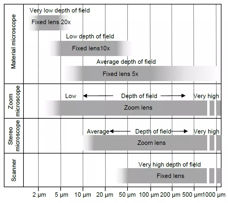 光学显微技术是清洁度检测最常用的方法,VDA19标准列出了各类型显微镜分析的尺寸范围,材料显微镜具有更高的XY分辨能力,可以分析更小尺寸的颗粒,放大倍数20X及以上物镜的数值孔径大于0.4,常用于颗粒高度分析;变焦显微镜和立体显微镜拥有更大的景深和视野,通常用于大颗粒的快速分析。