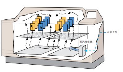 潮湿功能下,CCT型盐雾箱通过将热的水蒸汽导入盐雾箱内使试验箱内保持95-100%的相对湿度。需要去离子水以进行正常操作。蒸汽发生器的加热器可保持设定的箱内温度。Q-FOG CRH 型号使用RH控制,替代了高湿功能。