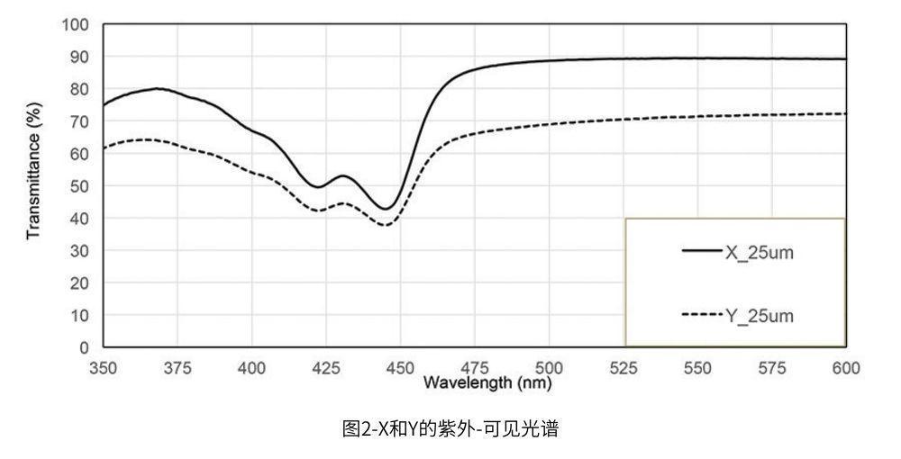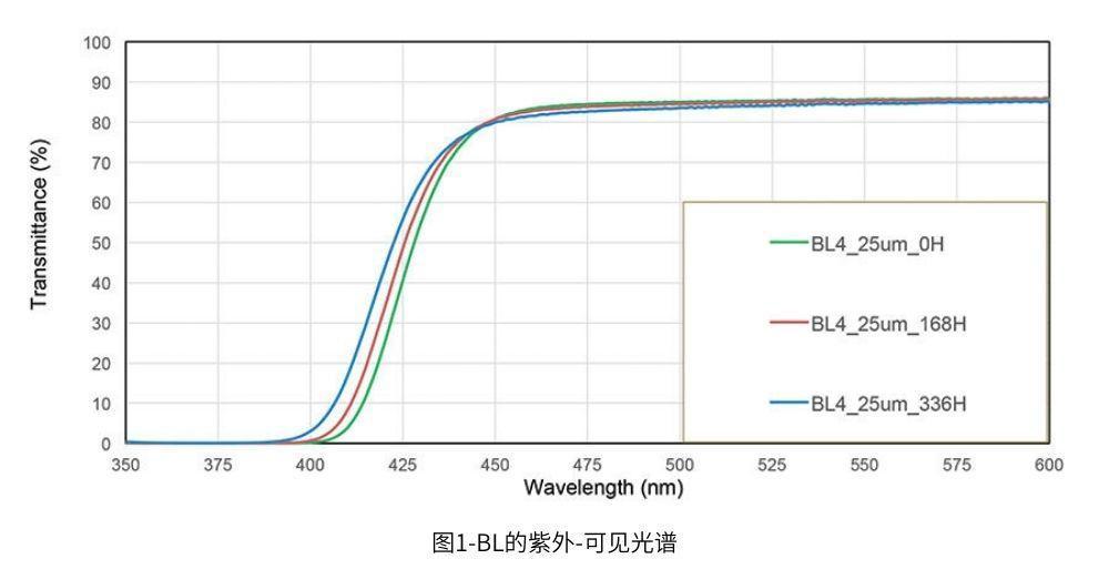 BL的透射率如图1和表2所示。BL是一种25微米的光学透明粘合剂,能够阻挡410纳米的光透射,允许不到5%的光透过。样品在500纳米处的透射率保持相当高。