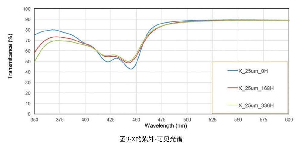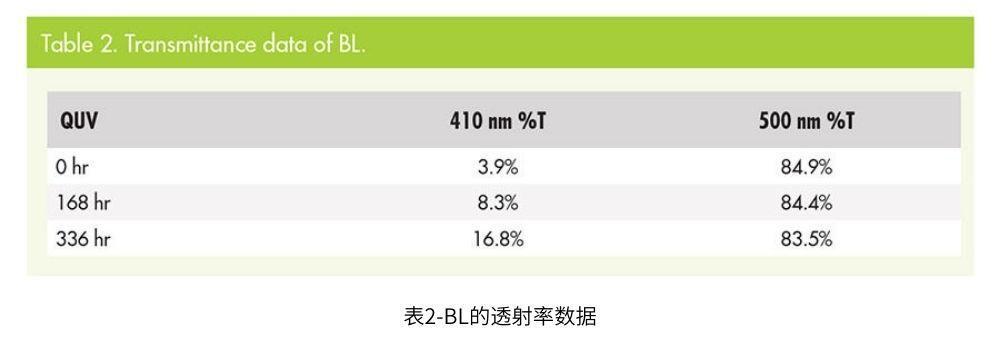 在QUV紫外老化箱进行加速老化试验后,观察紫外-可见光谱的变化。随着紫外加速时间的推移,410-460 nm处的x透射率越来越高,如图3所示(第14页)。这是辐射导致染料降解的结果。如果聚合物含有吸收光线的杂质,它就会对紫外线敏感。因此,透射率在紫外区下降。相比之下,通过照射,BL在380-440 nm区域轻微退化,并且在500 nm的透射率结果保持相当高。