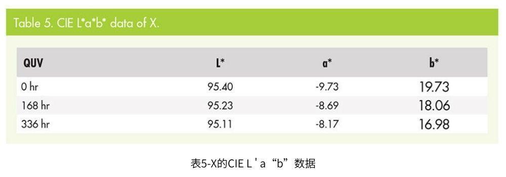 如果b*色是深黄色,会影响人的视线。BL是一种25 m的光学透明粘合剂,其b*值为9.08(见表4)。相对而言,X显示b*为19.73,随着QUV加速老化测试时间的推移,越来越低(见第16页表5)。所以BL耐候性比黄色溶剂染料好,不影响视觉变化。