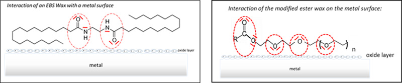 化学结构产生的脱模/润滑作用:改性聚酯蜡的极性酯基团和线性分子,使得它与金属表面有很好的附着力和亲和力。这种附着力在金属加工时提供了离型/润滑效果。