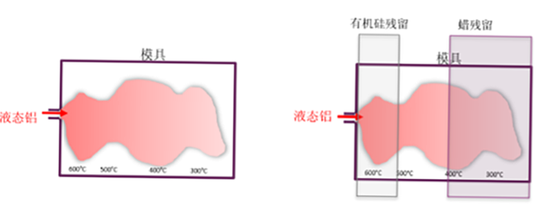 在压铸过程中我们发现模具中不同空间位置的温度不同。热的铝被压进模具并且在里面冷却,导致模具不均匀的温度分布。在模具中温度低的部分会时常出现蜡堆积后产生的残渣。这些残渣会带来铸造过程中模具最大压力的降低和尺寸偏差。 冷区域里温度不足以燃烧掉所有的蜡,导致蜡容易堆积需要用机械外力清除。