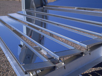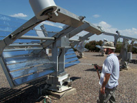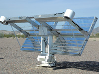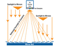 | 测试样品放置在镜面背面,以重新吸收反射的太阳光。Q-TRAC 系统在测试耐久性材料方面表现尤为出色。 | 利用一系列 10 镜面阵列反射全光谱太阳光,并将其集中至测试样品上。镜面调节对系统性能至关重要。 |