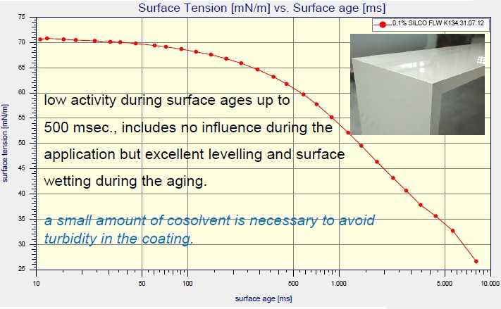 上图为某品牌0.1%流平剂水溶液,在500ms气泡寿命以内的表活迁移速度很慢,对涂布时润湿没有影响。 在500ms以上的气泡寿命,表面张力下降很快。在实际应用中,流平时可以达到很好的效果。