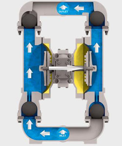 隔膜泵有两个对称的装有弹性隔膜的工作腔,隔膜用隔膜连杆连成一体,压缩空气从泵的进气接头进入中间体后,推动两个工作腔内的隔膜,驱动连杆联结的隔膜同步运动。