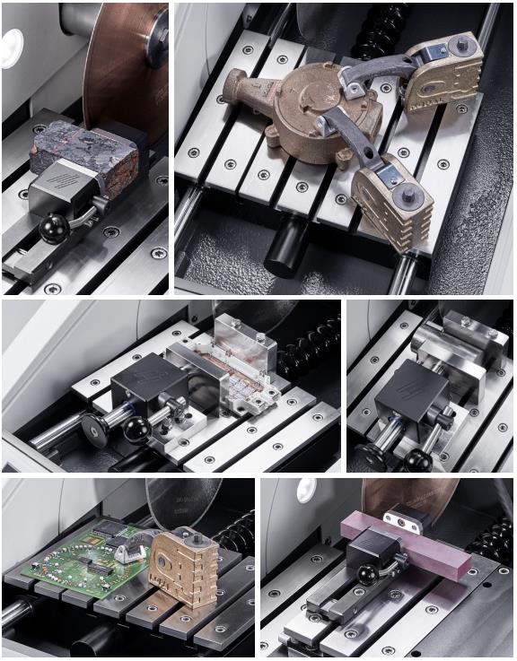 Secotom 的切割轮可在 40 mm (1.6") 的范围内调整高度,从而可以使用多种夹具,也可以使用燕尾槽试样夹具座。此外,它可以使用各种尺寸的切割轮,因此易于补偿轮磨损。