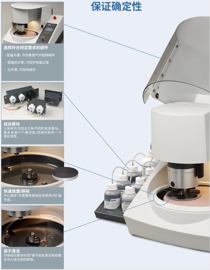用于在包括圆锥体的 200 mm MD-Disc 上研磨和抛光试样的微处理器控制的自动机器。加液模块,包括圆锥体的 MD-Disc 以及试样夹具座需要单独订购。可订购包括或者不包括透明盖板的 Tegramin-20。