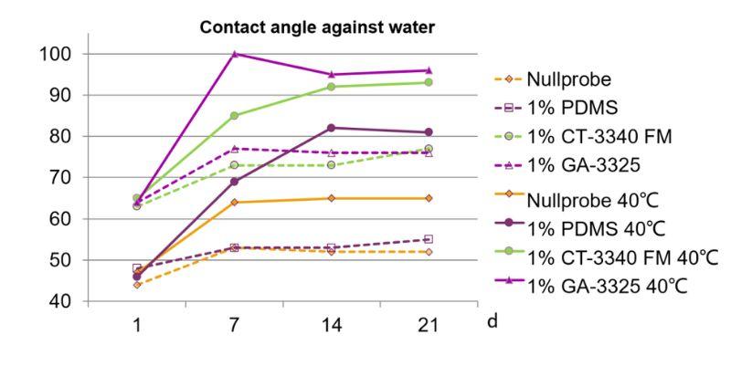 利用不同类型疏水添加剂的商用外墙涂料配方中接触角(纵轴)随时间(横坐标)和温度(常温与40℃)的比较,结果显示非离子的GA3325在常温及40℃下具有更强疏水性。