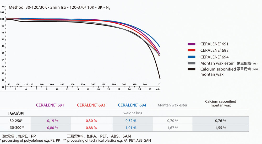 ※不同的工程用树脂如PC,PS,PA,ABS,POM,PET,PE和PP,提供优异的温度稳定性﹑极低的挥发性以及改善表面光泽,不会导致析出